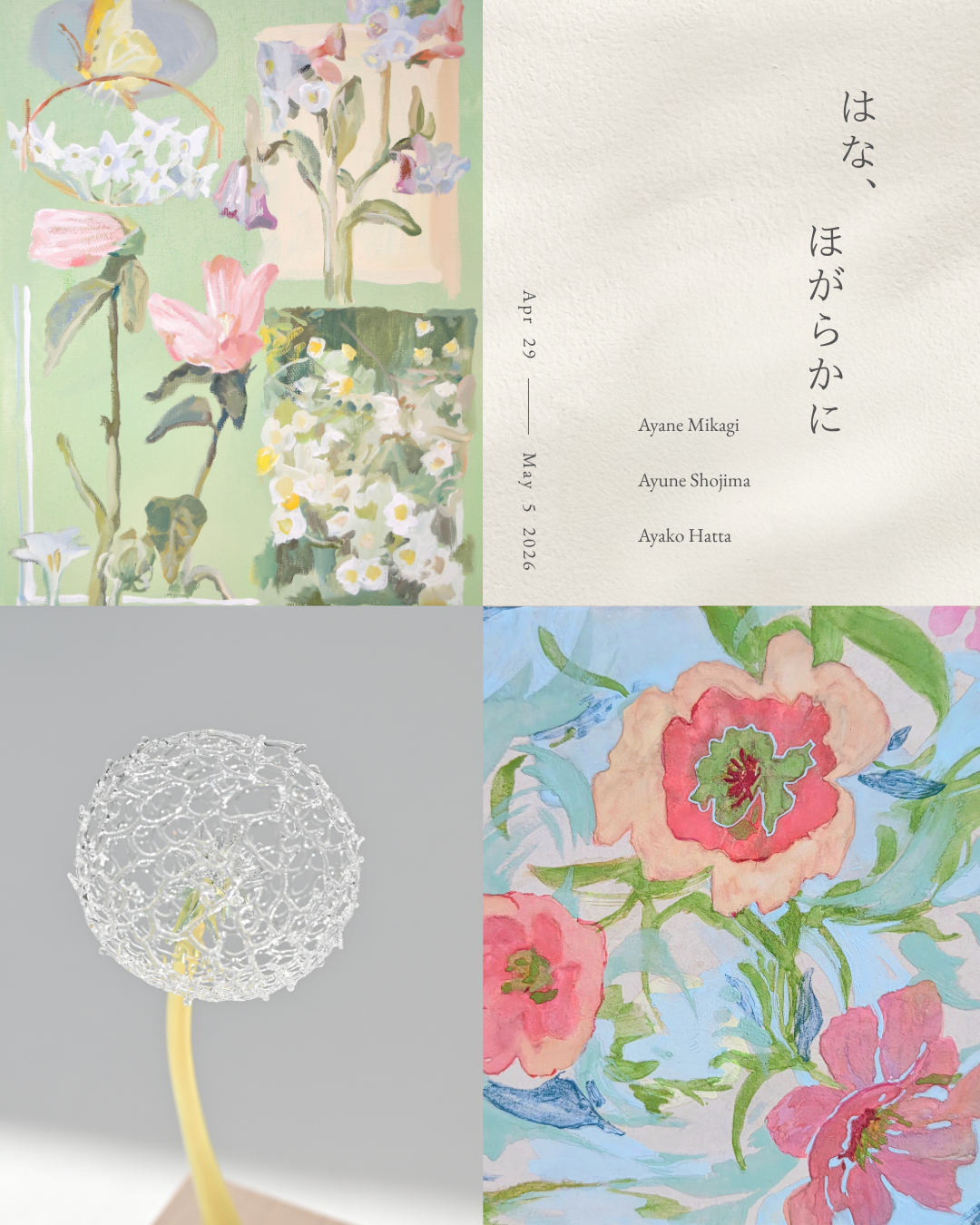 2026年4月29日(水・祝)– 5月5日(火・祝)のゴールデンウイーク期間に、三鑰彩音、庄島歩音、八田綾子による展覧会「はな、ほがらかに」を開催いたします。